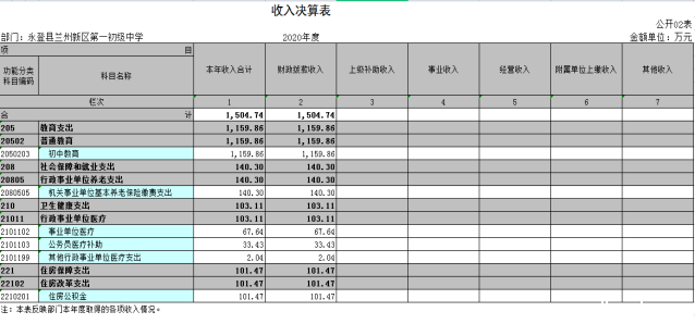 2020年度收、支总计1,504.74万元。收、支较上年决算数增加1,504.74万元,增长100%,主要原因是兰州新区第一初级中学自2017年8月至2019年12月,所有经济活动由兰州新区中川学区代管。根据上级文件精神自2020年1月起作为独立预算决算单位,学校人员和学生人数由兰州新区中川学区根据实际划拨,各项经费收支由我校独立完成。