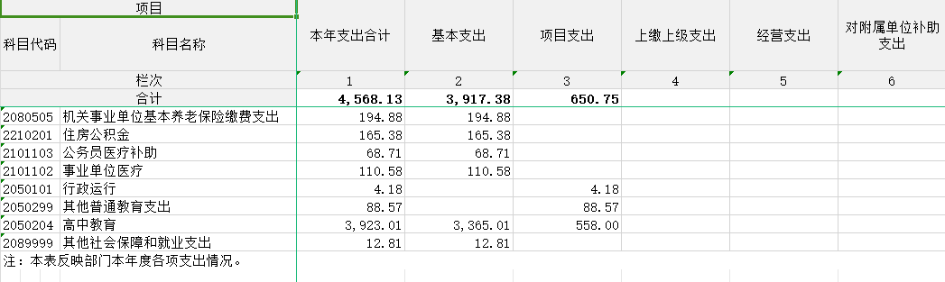 十五:社会保障和就业支出(类)其他社会保障和就业支出(款)其他社会保障和就业支出(项):反映除社会保障和就业支出(类)(01-30款)以外其他用于社会保障和就业方面的支出。十六:卫生健康支出(类)行政事业单位医疗(款)事业单位医疗(项):反映财政部门安排的事业单位基本医疗保险缴费经费、未参加医疗保险的事业单位的公费医疗经费,按照国家规定享受离休人员待遇的医疗经费。十七:卫生健康支出(类)行政事业单位医疗(款)公务员医疗补助(项):反映财政部门安排的公务员医疗补助经费。十七:住房保障支出(类)住房改革支出(款)住房公积金(项):反映行政事业单位按人力资源和社会保障部、财政部规定的基本工资和津贴补贴以及规定比例为职工缴纳的住房公积金。十九:教育支出(类)普通教育(款)初中教育(项):反映各部分举办的高中教育支出。政府各部门对社会组织等举办的高中的资助,如捐赠、补贴等,也在本科目中反映。二十:教育支出(类)普通教育(款)其他普通教育支出(项):反映除了普通教育(款)(01-05项)以外其他用于普通教育方面的支出。