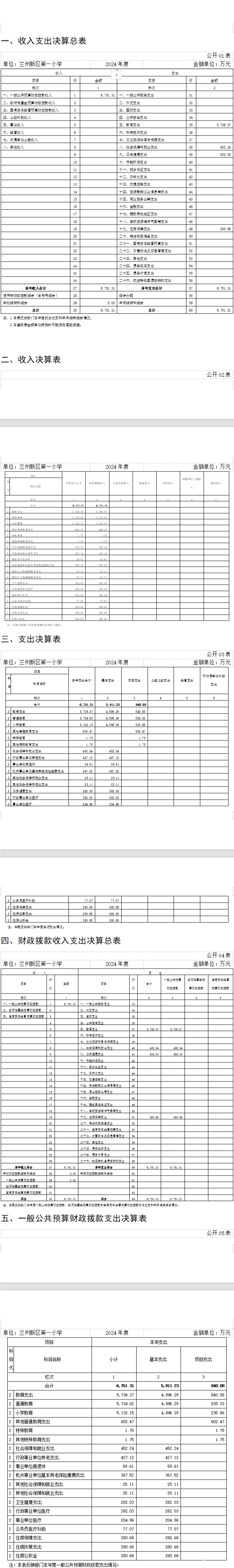 2024年度纳入本部门会计报表编制汇编范围的独立核算单位共1个。其中按单位基本性质,兰州新区第一小学属事业单位;按单位执行会计制度,兰州新区第一小学执行政府会计制度;按单位预算级次,兰州新区第一小学属二级预算单位。